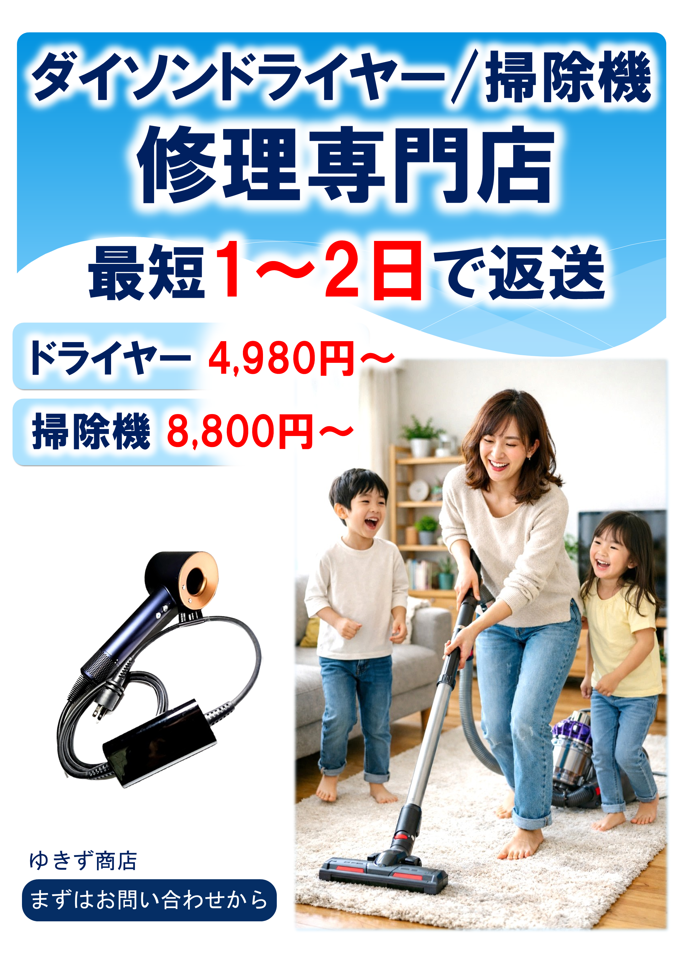 八王子市の「ゆきず商店」は、ダイソンドライヤー・掃除機専門の修理店。八王子商工会登録店の安心感と、迅速・丁寧な対応が強みです。全国配送・持込修理対応。ダイソンの故障はお任せください。